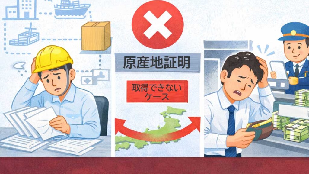 実務上もっとも多いのがこのケースです。中小サプライヤーが原材料証明を整備しておらず、原産証明書の発給に必要な資料を提出できない状況です。